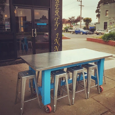 | Spotted Gum top, with steel frame base. |